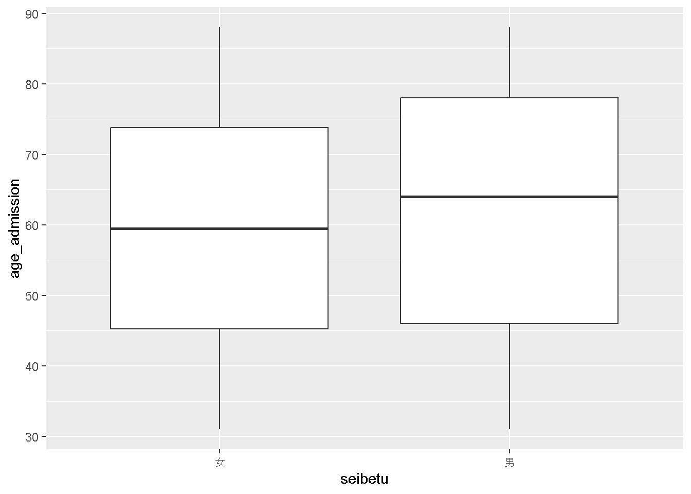 実例1:男女別の入院時年齢を箱ひげ図にしてみる。