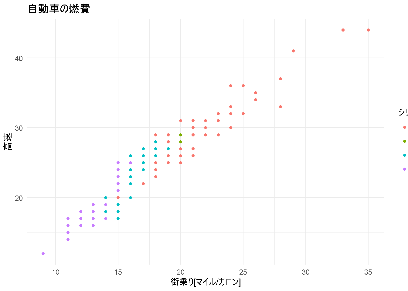labs(title = "自動車の燃費", x = "街乗り[マイル/ガロン]", y = "高速") +