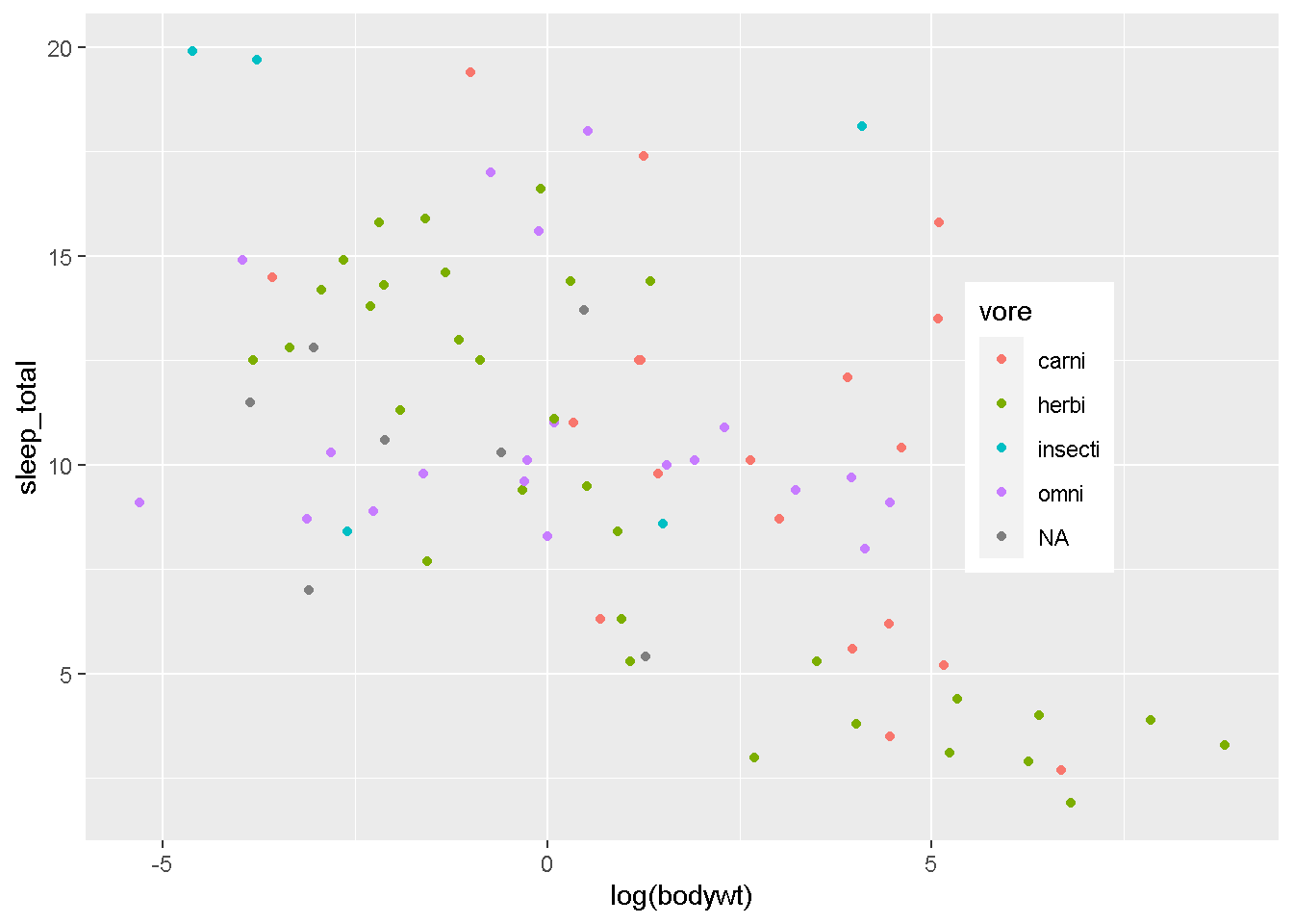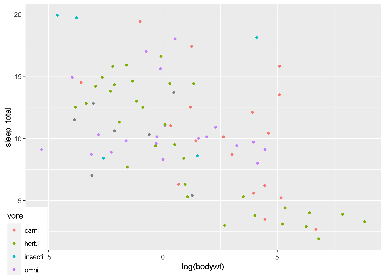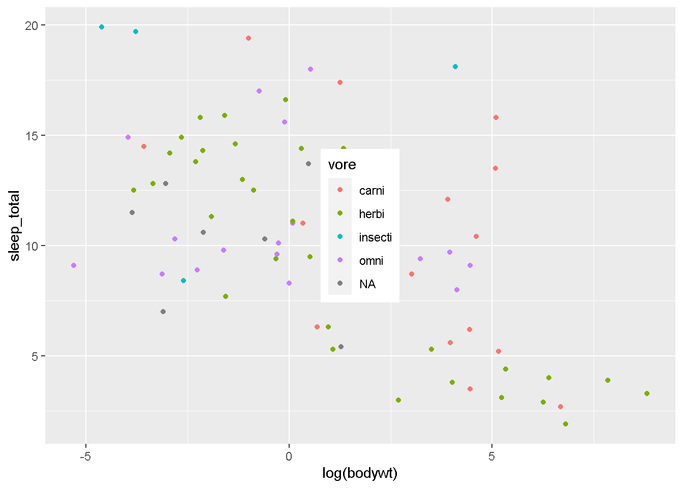 geom_point(aes(x=log(bodywt),y=sleep_total,color=vore))