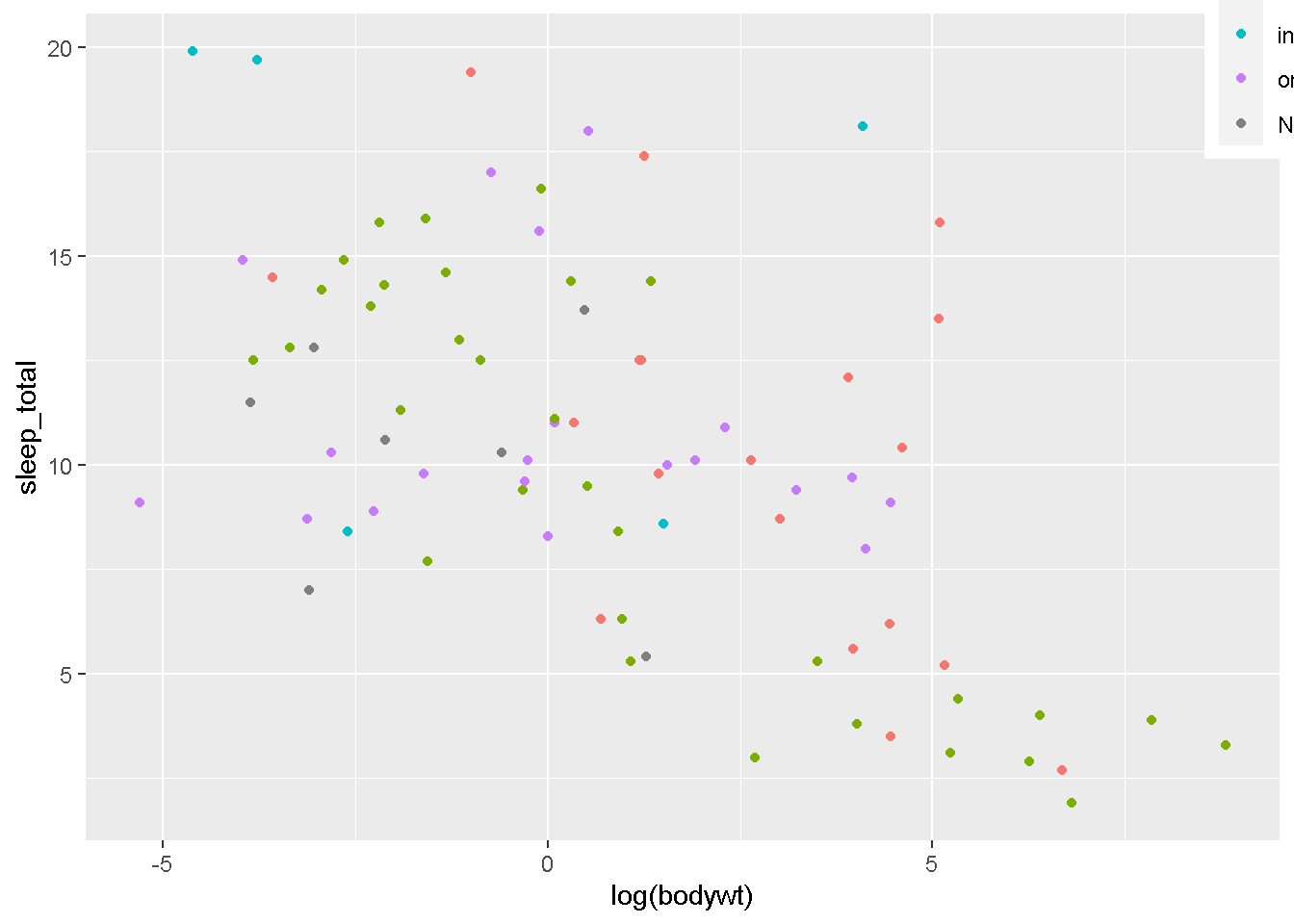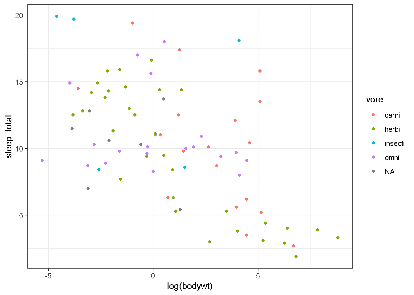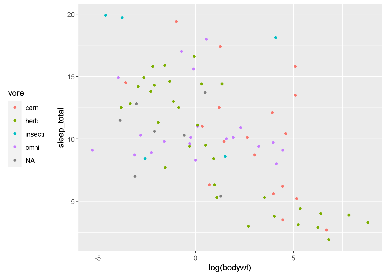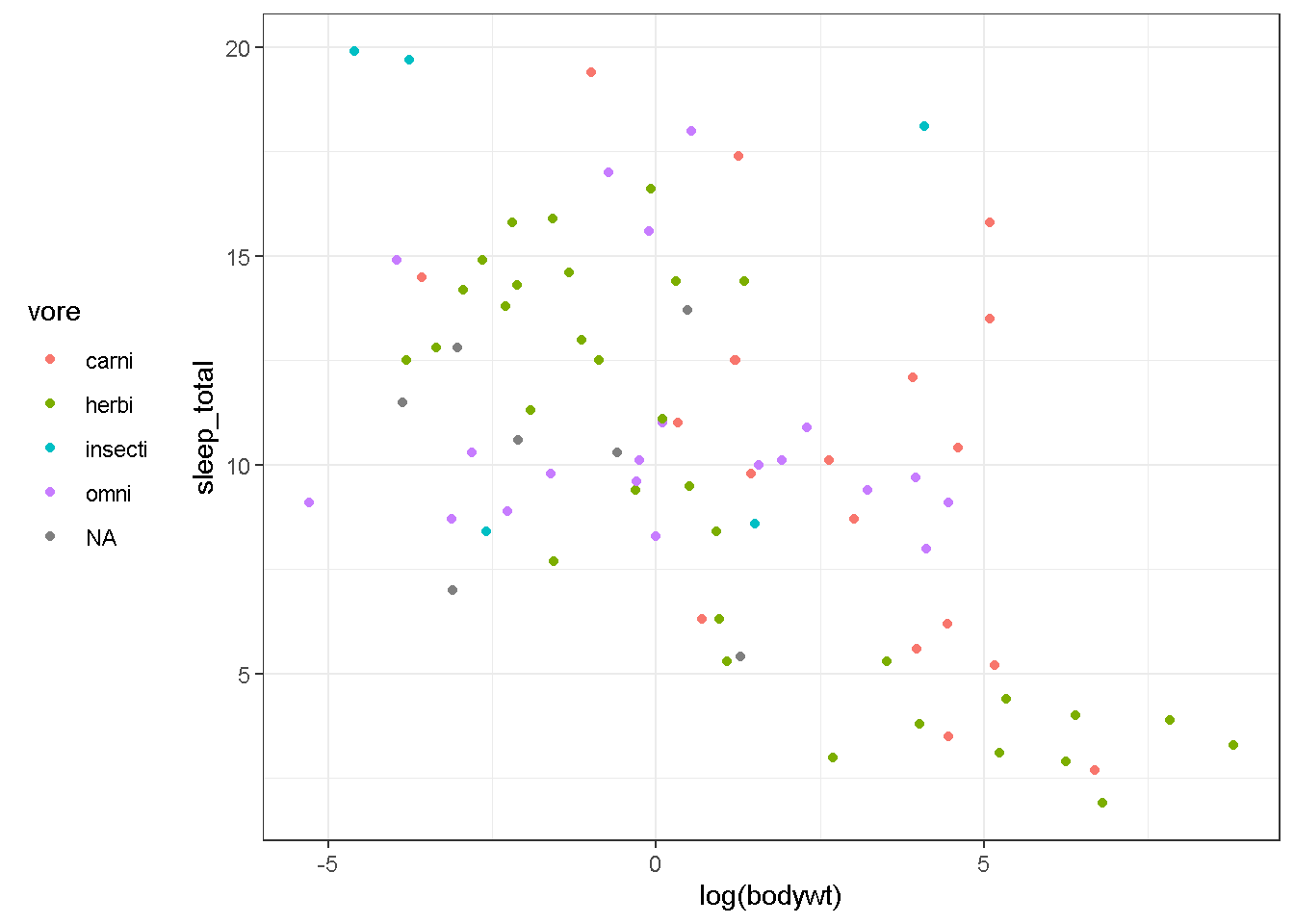 geom_point(aes(x=log(bodywt),y=sleep_total,color=vore))