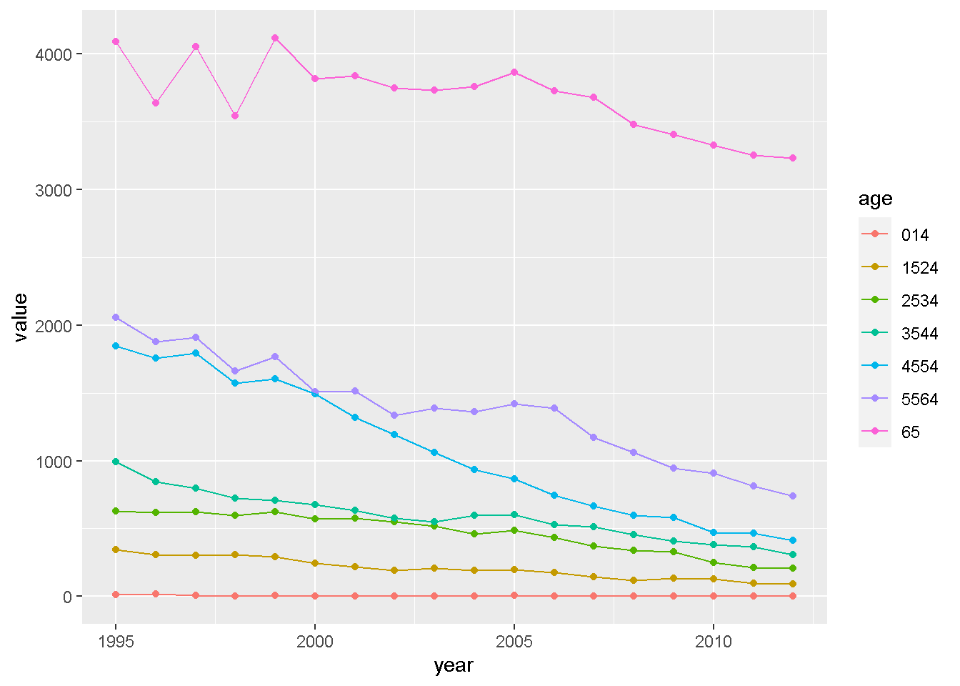 geom_line(aes(x = year, y = value, color = age, group=age))