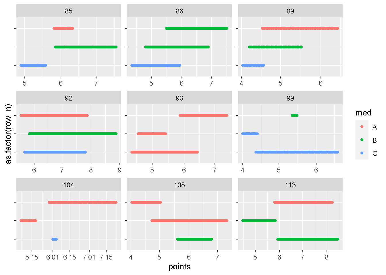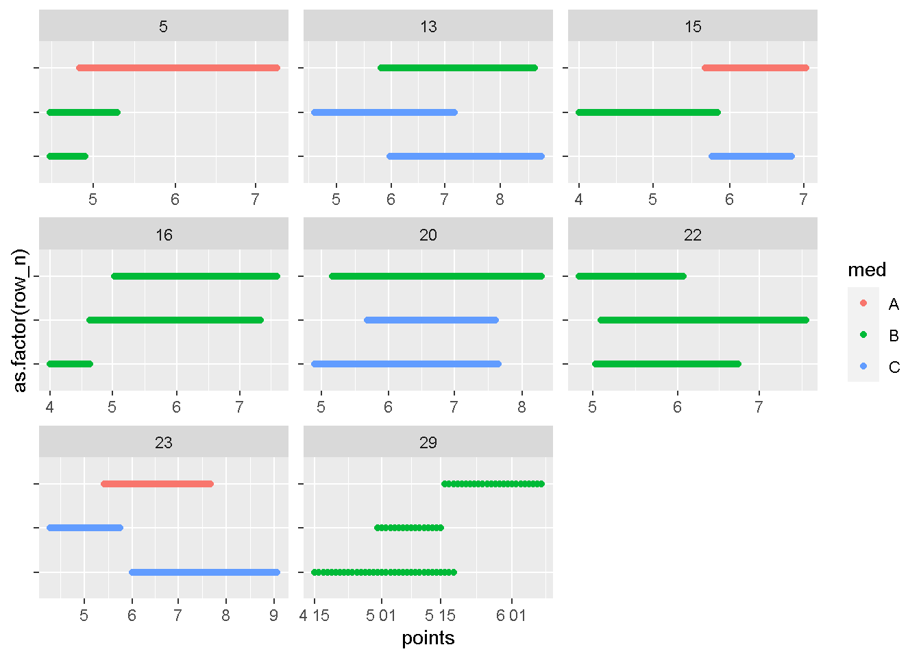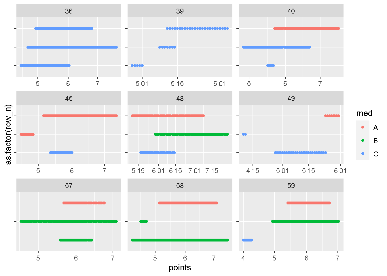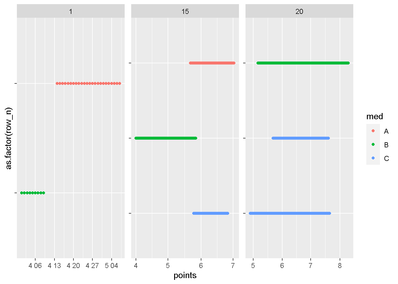 geom_point(aes(x = points, y = as.factor(row_n), color = med)) +