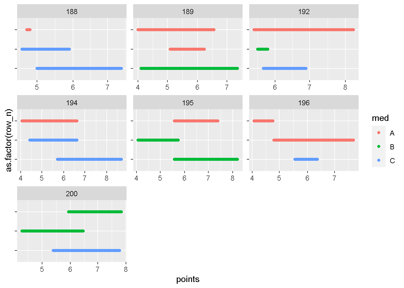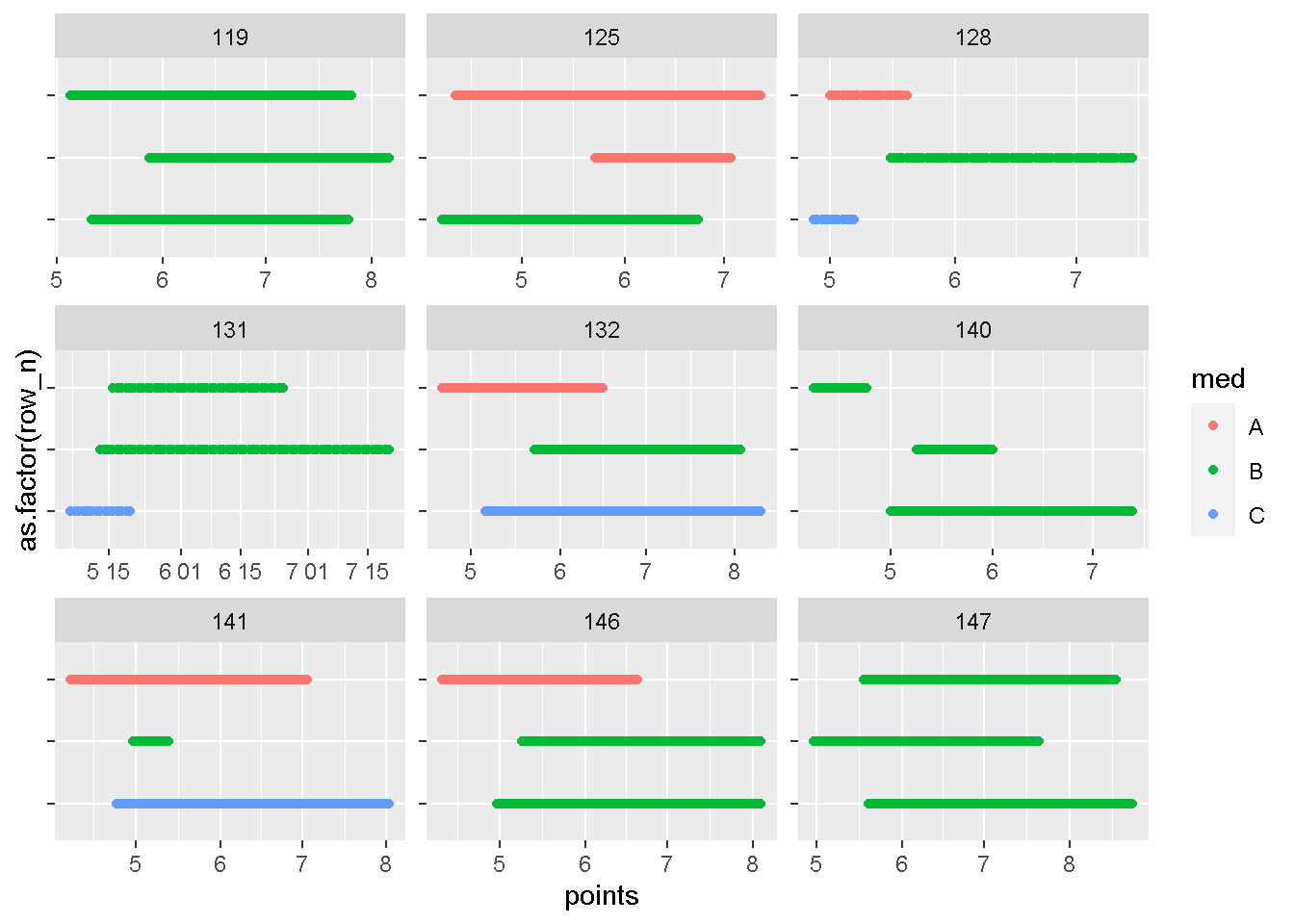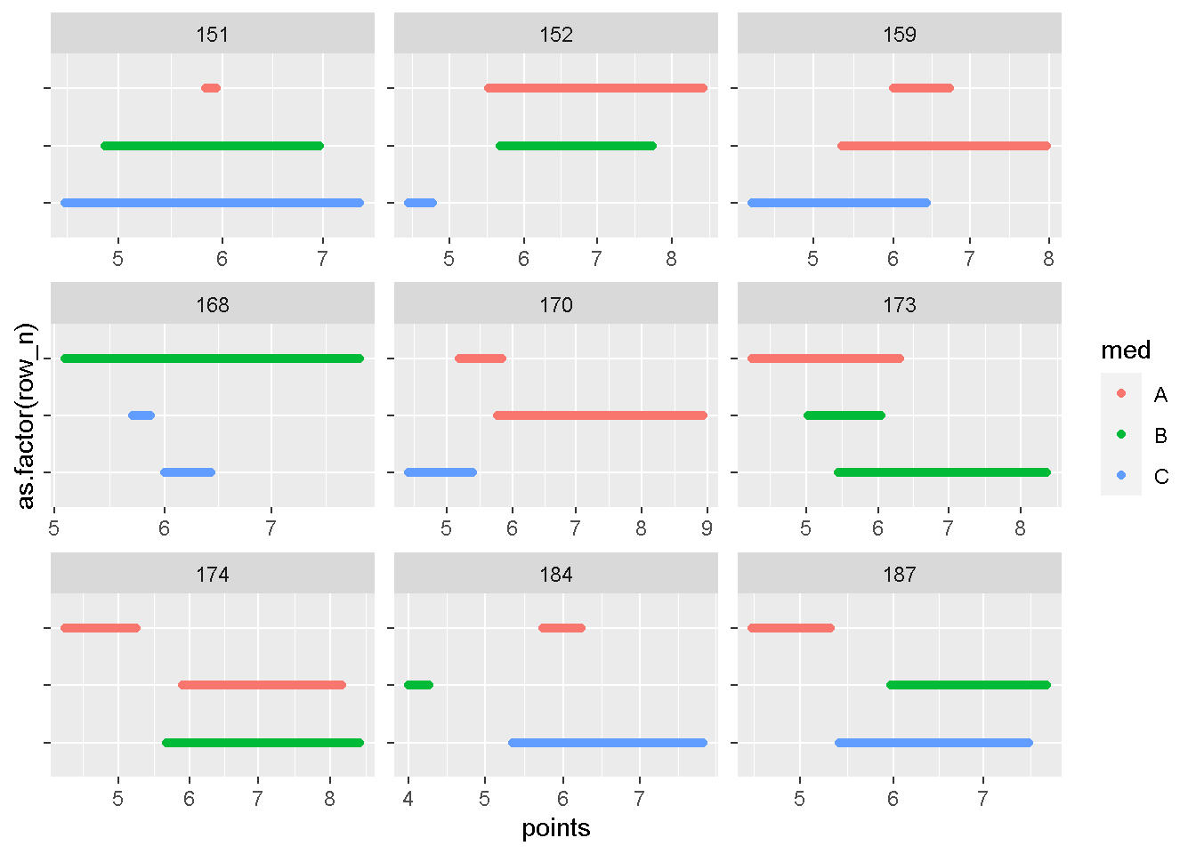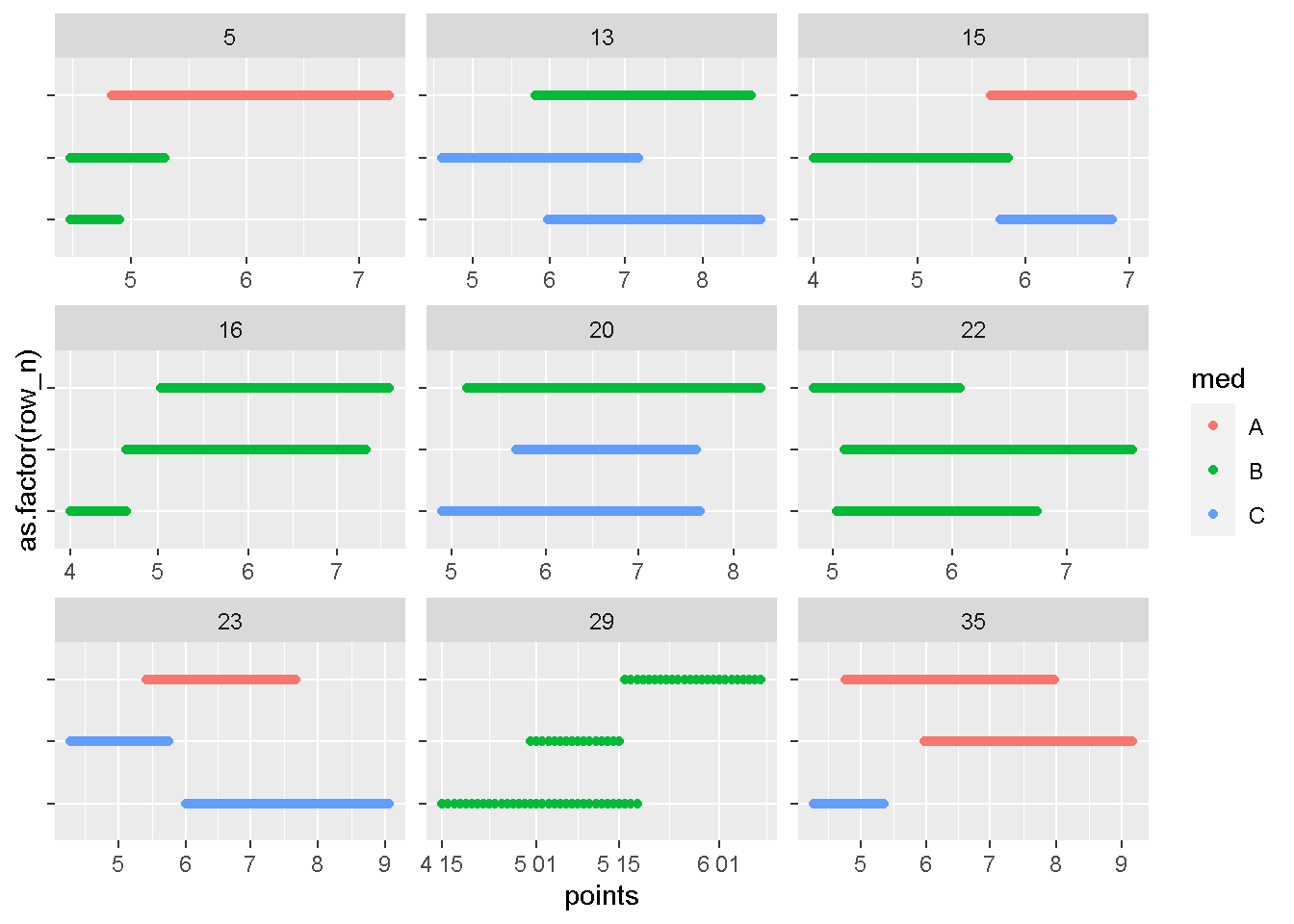 geom_point(aes(x = points, y = as.factor(row_n), color = med)) +