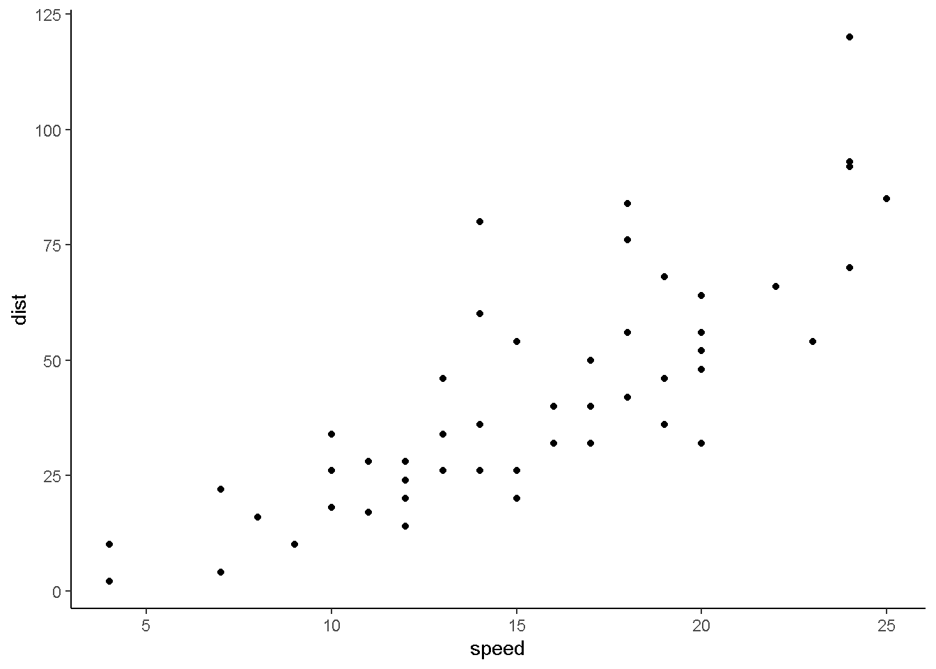 <div class="tabwid"><style>.cl-2d9cd562{}.cl-2d8229d8{font-family:'Arial';font-size:11pt;font-weight:bold;font-style:normal;text-decoration:none;color:rgba(0, 0, 0, 1.00);background-color:transparent;}.cl-2d822a28{font-family:'Arial';font-size:6.6pt;font-weight:normal;font-style:normal;text-decoration:none;color:rgba(0, 0, 0, 1.00);background-color:transparent;position: relative;bottom:3.3pt;}.cl-2d822a29{font-family:'Arial';font-size:11pt;font-weight:normal;font-style:normal;text-decoration:none;color:rgba(0, 0, 0, 1.00);background-color:transparent;}.cl-2d8b5238{margin:0;text-align:left;border-bottom: 0 solid rgba(0, 0, 0, 1.00);border-top: 0 solid rgba(0, 0, 0, 1.00);border-left: 0 solid rgba(0, 0, 0, 1.00);border-right: 0 solid rgba(0, 0, 0, 1.00);padding-bottom:2pt;padding-top:2pt;padding-left:5pt;padding-right:5pt;line-height: 1;background-color:transparent;}.cl-2d8b5242{margin:0;text-align:center;border-bottom: 0 solid rgba(0, 0, 0, 1.00);border-top: 0 solid rgba(0, 0, 0, 1.00);border-left: 0 solid rgba(0, 0, 0, 1.00);border-right: 0 solid rgba(0, 0, 0, 1.00);padding-bottom:2pt;padding-top:2pt;padding-left:5pt;padding-right:5pt;line-height: 1;background-color:transparent;}.cl-2d8b524c{margin:0;text-align:left;border-bottom: 0 solid rgba(0, 0, 0, 1.00);border-top: 0 solid rgba(0, 0, 0, 1.00);border-left: 0 solid rgba(0, 0, 0, 1.00);border-right: 0 solid rgba(0, 0, 0, 1.00);padding-bottom:5pt;padding-top:5pt;padding-left:5pt;padding-right:5pt;line-height: 1;background-color:transparent;}.cl-2d8b524d{margin:0;text-align:center;border-bottom: 0 solid rgba(0, 0, 0, 1.00);border-top: 0 solid rgba(0, 0, 0, 1.00);border-left: 0 solid rgba(0, 0, 0, 1.00);border-right: 0 solid rgba(0, 0, 0, 1.00);padding-bottom:5pt;padding-top:5pt;padding-left:5pt;padding-right:5pt;line-height: 1;background-color:transparent;}.cl-2d8b5256{margin:0;text-align:left;border-bottom: 0 solid rgba(0, 0, 0, 1.00);border-top: 0 solid rgba(0, 0, 0, 1.00);border-left: 0 solid rgba(0, 0, 0, 1.00);border-right: 0 solid rgba(0, 0, 0, 1.00);padding-bottom:5pt;padding-top:5pt;padding-left:5pt;padding-right:5pt;line-height: 1;background-color:transparent;}.cl-2d8b81b8{width:1.304in;background-color:transparent;vertical-align: middle;border-bottom: 1pt solid rgba(0, 0, 0, 1.00);border-top: 1pt solid rgba(0, 0, 0, 1.00);border-left: 0 solid rgba(0, 0, 0, 1.00);border-right: 0 solid rgba(0, 0, 0, 1.00);margin-bottom:0;margin-top:0;margin-left:0;margin-right:0;}.cl-2d8b81c2{width:1.406in;background-color:transparent;vertical-align: middle;border-bottom: 1pt solid rgba(0, 0, 0, 1.00);border-top: 1pt solid rgba(0, 0, 0, 1.00);border-left: 0 solid rgba(0, 0, 0, 1.00);border-right: 0 solid rgba(0, 0, 0, 1.00);margin-bottom:0;margin-top:0;margin-left:0;margin-right:0;}.cl-2d8b81cc{width:1.304in;background-color:transparent;vertical-align: top;border-bottom: 0 solid rgba(0, 0, 0, 1.00);border-top: 0 solid rgba(0, 0, 0, 1.00);border-left: 0 solid rgba(0, 0, 0, 1.00);border-right: 0 solid rgba(0, 0, 0, 1.00);margin-bottom:0;margin-top:0;margin-left:0;margin-right:0;}.cl-2d8b81cd{width:1.406in;background-color:transparent;vertical-align: top;border-bottom: 0 solid rgba(0, 0, 0, 1.00);border-top: 0 solid rgba(0, 0, 0, 1.00);border-left: 0 solid rgba(0, 0, 0, 1.00);border-right: 0 solid rgba(0, 0, 0, 1.00);margin-bottom:0;margin-top:0;margin-left:0;margin-right:0;}.cl-2d8b81d6{width:1.304in;background-color:transparent;vertical-align: top;border-bottom: 1pt solid rgba(0, 0, 0, 1.00);border-top: 0 solid rgba(0, 0, 0, 1.00);border-left: 0 solid rgba(0, 0, 0, 1.00);border-right: 0 solid rgba(0, 0, 0, 1.00);margin-bottom:0;margin-top:0;margin-left:0;margin-right:0;}.cl-2d8b81e0{width:1.406in;background-color:transparent;vertical-align: top;border-bottom: 1pt solid rgba(0, 0, 0, 1.00);border-top: 0 solid rgba(0, 0, 0, 1.00);border-left: 0 solid rgba(0, 0, 0, 1.00);border-right: 0 solid rgba(0, 0, 0, 1.00);margin-bottom:0;margin-top:0;margin-left:0;margin-right:0;}.cl-2d8b81e1{width:1.304in;background-color:transparent;vertical-align: middle;border-bottom: 0 solid rgba(255, 255, 255, 0.00);border-top: 0 solid rgba(255, 255, 255, 0.00);border-left: 0 solid rgba(255, 255, 255, 0.00);border-right: 0 solid rgba(255, 255, 255, 0.00);margin-bottom:0;margin-top:0;margin-left:0;margin-right:0;}.cl-2d8b81e2{width:1.406in;background-color:transparent;vertical-align: middle;border-bottom: 0 solid rgba(255, 255, 255, 0.00);border-top: 0 solid rgba(255, 255, 255, 0.00);border-left: 0 solid rgba(255, 255, 255, 0.00);border-right: 0 solid rgba(255, 255, 255, 0.00);margin-bottom:0;margin-top:0;margin-left:0;margin-right:0;}</style><table data-quarto-disable-processing='true' class='cl-2d9cd562'><thead><tr style="overflow-wrap:break-word;"><th class="cl-2d8b81b8"><p class="cl-2d8b5238"><span class="cl-2d8229d8">Characteristic</span></p></th><th class="cl-2d8b81c2"><p class="cl-2d8b5242"><span class="cl-2d8229d8">N = 50</span><span class="cl-2d822a28">1</span></p></th></tr></thead><tbody><tr style="overflow-wrap:break-word;"><td class="cl-2d8b81cc"><p class="cl-2d8b524c"><span class="cl-2d822a29">speed</span></p></td><td class="cl-2d8b81cd"><p class="cl-2d8b524d"><span class="cl-2d822a29">15.0 (12.0, 19.0)</span></p></td></tr><tr style="overflow-wrap:break-word;"><td class="cl-2d8b81d6"><p class="cl-2d8b524c"><span class="cl-2d822a29">dist</span></p></td><td class="cl-2d8b81e0"><p class="cl-2d8b524d"><span class="cl-2d822a29">36 (26, 56)</span></p></td></tr></tbody><tfoot><tr style="overflow-wrap:break-word;"><td colspan="2"class="cl-2d8b81e1"><p class="cl-2d8b5256"><span class="cl-2d822a28">1</span><span class="cl-2d822a29">Median (IQR)</span></p></td></tr></tfoot></table></div>
