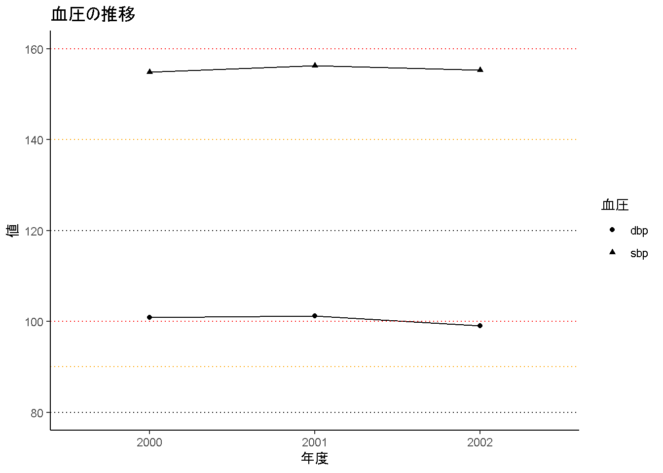 labs(x = "年度", y = "値", title = "血圧の推移") +